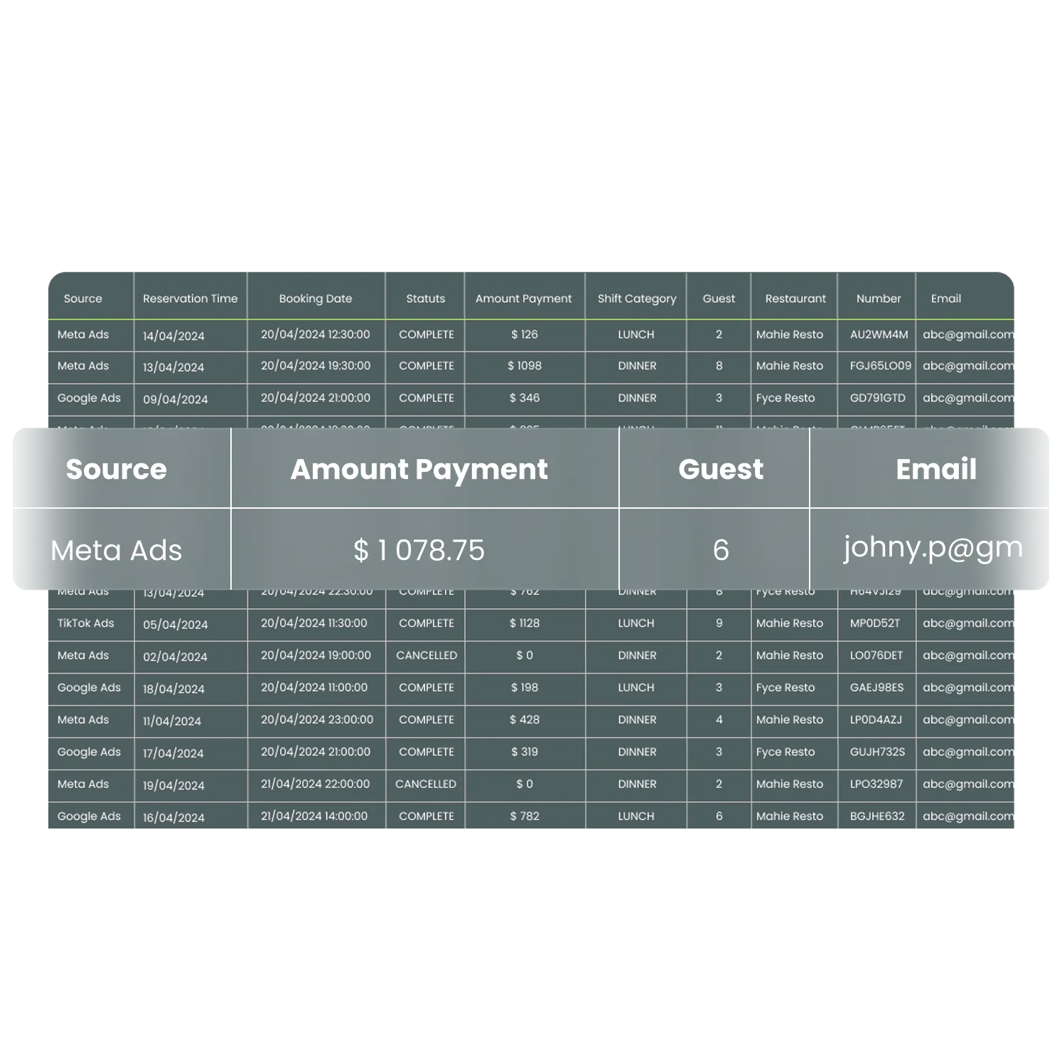 In a clear, actionable table, see the reservation date, amount spent, visit status (showed up, cancelled, no-show…), number of visits, and even their lifetime value (LTV).